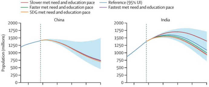 《柳叶刀》杂志预测不同场景下中国和印度的人口趋势