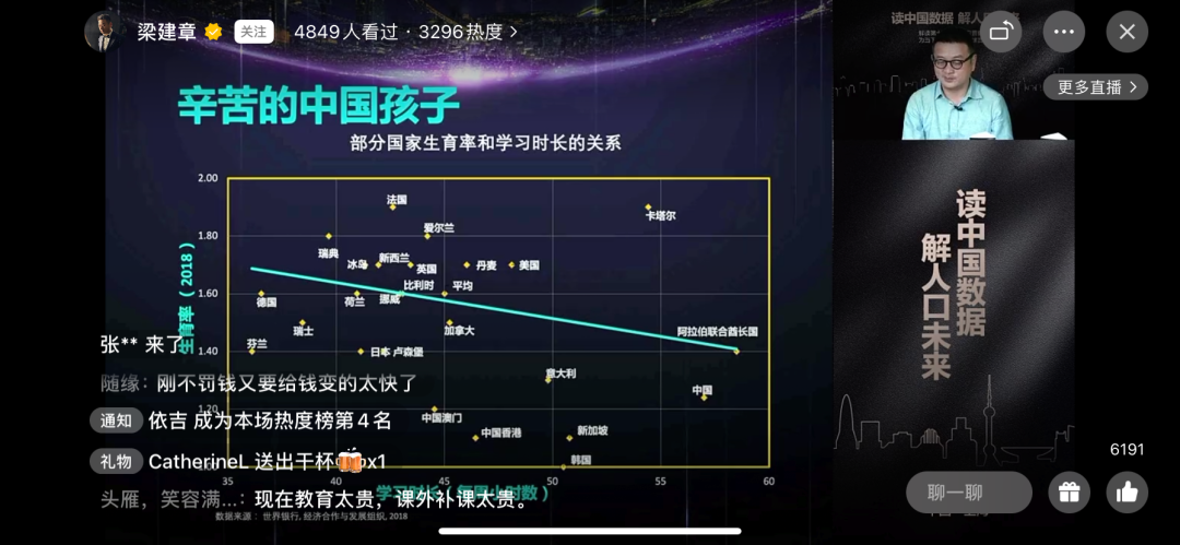 梁建章在直播中提到学习时长与生育率的关系