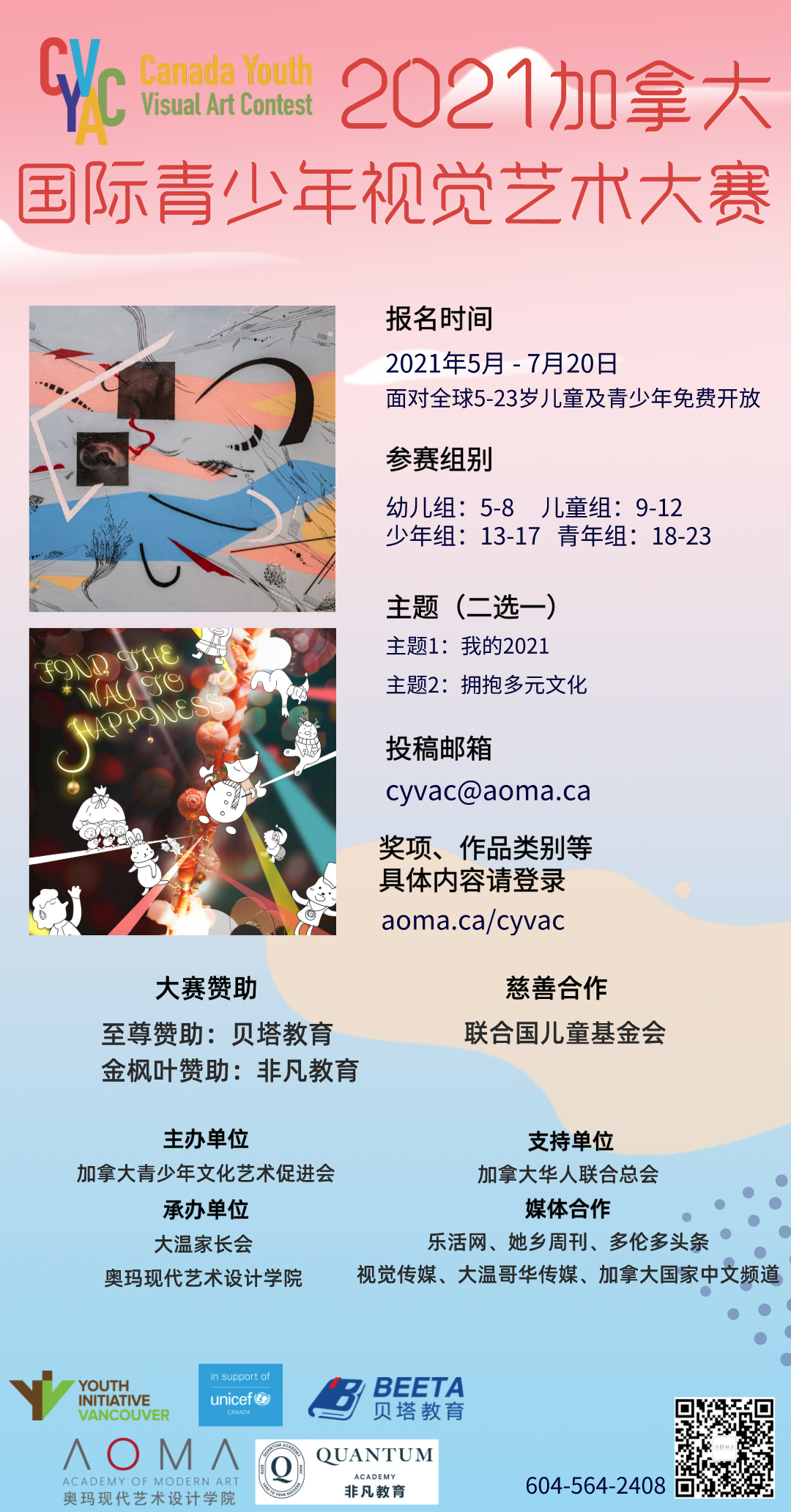 2021 加拿大国际青少年视觉艺术大赛由加拿大青少年文化艺术促进会(YIV)主办,大温家长会和奥玛现代艺术设计学院(AOMA)承办。大赛以开展多元文化交流以及慈善公益为目的,发掘全球具有艺术和设计天分的优秀人才。我们特别邀请来自北美艺术院校教授、国际著名艺术家、国际级别评委等组成的阵容强大的评委团,评选出获奖作品并进行公益拍卖;义卖所得将捐赠给联合国儿童基金会帮助改善弱势儿童的环境,让他们能健康地成长。大赛主办方在过去五年承办过多次国际艺术大赛,积累了丰富的国际大赛组织经验,期待全球青少年积极参与并预祝这届大赛的圆满成功!