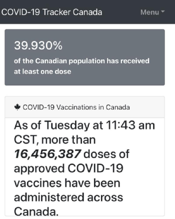 Covid19Tracker的数据显示,截止到5月11日上午11:43分,有16,456,387个加拿大居民已经接种了第一剂疫苗,约占总人口数的39.9%。