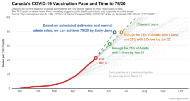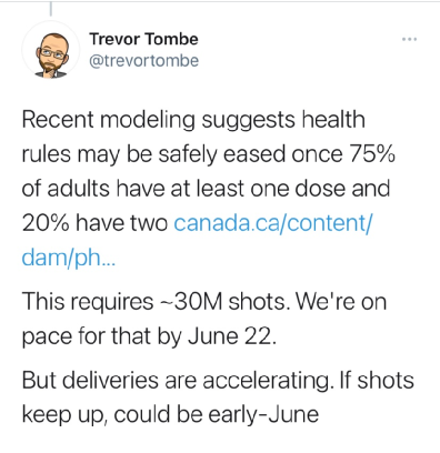 来自卡尔加里大学经济系的教授Trevor Tombe在推特上展示了他最新的数据模版,表明如果按照现有的接种速度,到今年6月22日,加拿大就能达到全民免疫的标准了。