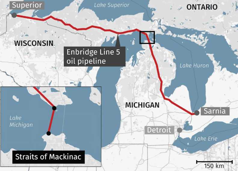 从2020年开始,加拿大安桥公司和美国密西根州一直在打官司,密西根州州长Whitmer认为5号输油管年代久远存在安全隐患,必须关闭;而拥有油管的安桥公司不同意,安桥坚称5号输油管是安全的,并已获得该州的批准,计划斥资5亿元在麦基诺水道下方挖一条隧道,容纳5号输油管的双管,使之免受船锚撞击。双方将官司打到了美国联邦法院。