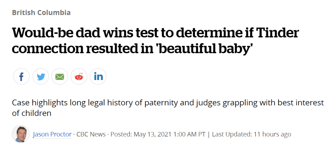 据CBC报道,这名“男小三”是该男子妻子的情人,二人于2018年4月在著名的社交软件Tinder(北美版探探)上认识,女方当时已婚,且育有两个孩子。他们分别在2018年5月、8月和11月发生了三次性关系。