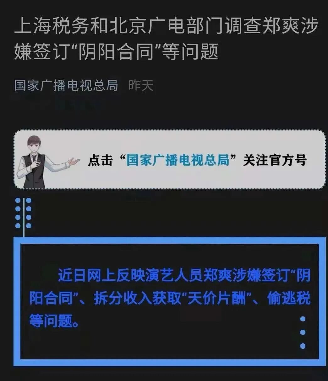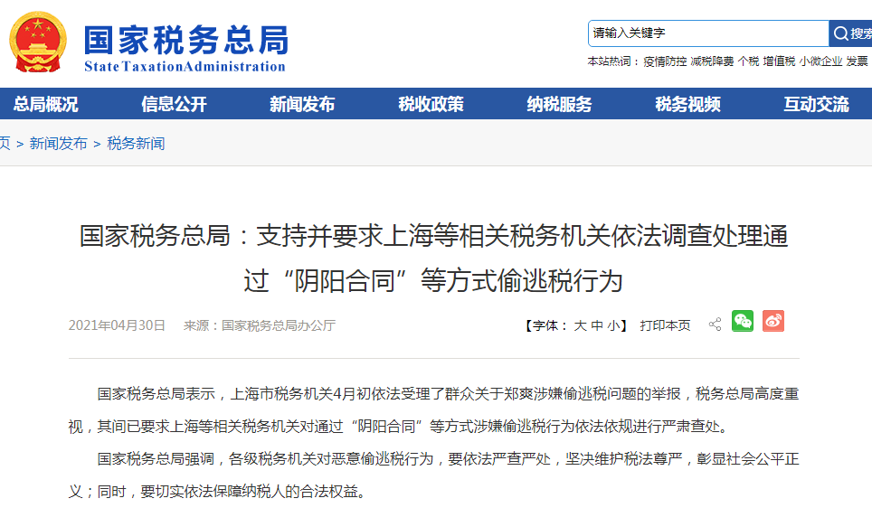 与此同时,4月30日国家税务总局在官网发布消息表示,上海市税务机关4月初依法受理了群众关于郑爽涉嫌偷逃税问题的举报,税务总局高度重视,其间已要求上海等相关税务机关对通过“阴阳合同”等方式涉嫌偷逃税行为依法依规进行严肃查处。