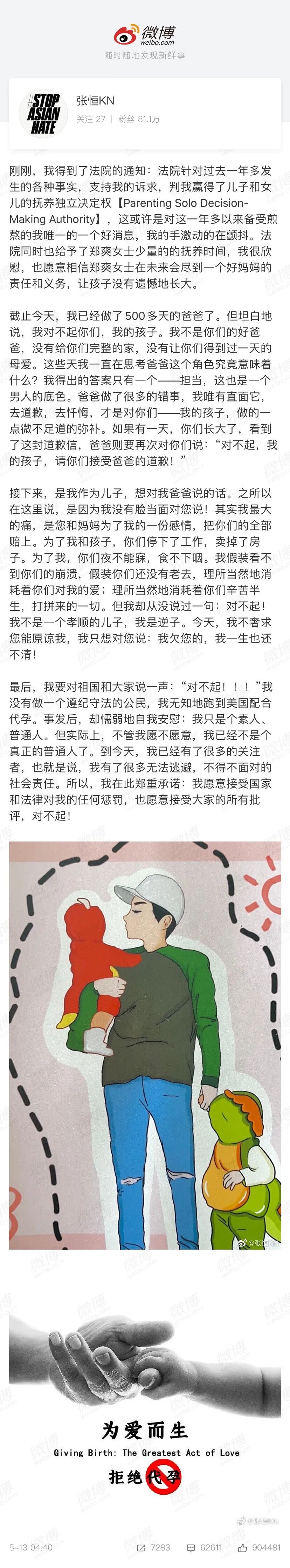 北京时间5月13日4点40分,张恒发表微博表示,他得到了法院的通知:法院针对过去一年多发生的各种事实,支持他的诉求,判他赢得了儿子和女儿的抚养独立决定权。