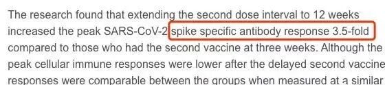 实验显示,第二次接种疫苗后,所有参与者均检测到了刺突特异性抗体。但是,三周间隔组的平均抗体浓度为1,138 U / ml,而12周间隔组的平均抗体浓度为4,030 U / ml,比三周组的高3.5倍。