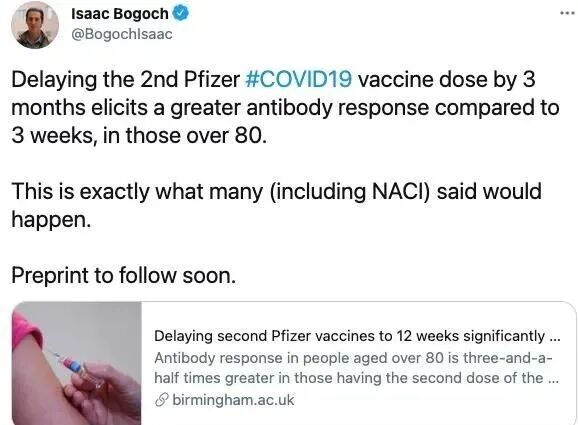 多伦多大学传染病专家艾萨克·博格奇(Isaac Bogoch)博士在Twitter上分享了这项研究,称结果恰好是加拿大国家免疫咨询委员会(NACI)所说的结果。