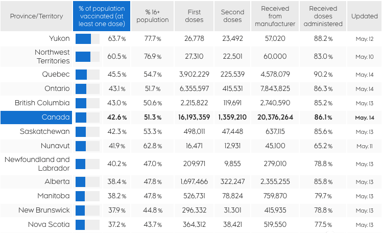 由于疫苗供应紧张,加拿大3月份更改第二剂接种时间,从3-4周推迟至最长16周,让更多的国民提前获得接种的机会,截止5月13日,加拿大已经有1750万名国民接种至少一剂,占总人口42.6%,16岁以上已经有51.3%比例获得接种。