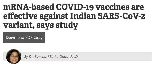 与此同时,不断有报道显示,辉瑞、Moderna等mRNA疫苗对印度变体有效,能够中和印度变种病毒。