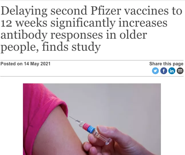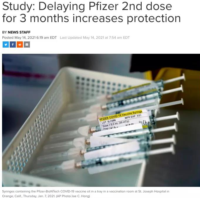 5月14日周五发布的研究是首次对辉瑞疫苗2剂间隔的临床试验测试,直接比较间隔3周和延长至12周间隔的免疫反应。