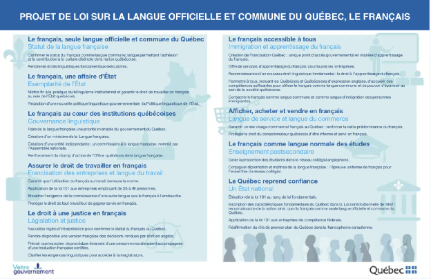 •废除高级语言委员会,设立一项新的政府部门——法语语言部(French Language Ministry),设立新的管理官员职位French-language commissioner,同时大幅增强法语监管机构OQLF的职权,允许其对境内各类法语语言相关活动强制干预;