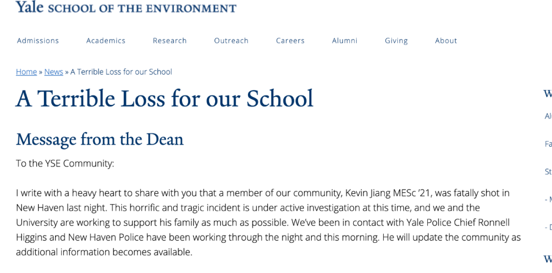 所在的环境学院发文哀悼:“我们学院的一名成员,即将在2021年毕业的凯文,昨晚在纽黑文被枪杀。这一可怕的悲剧正在积极调查中,学校正在尽可能支持他的家人。”
