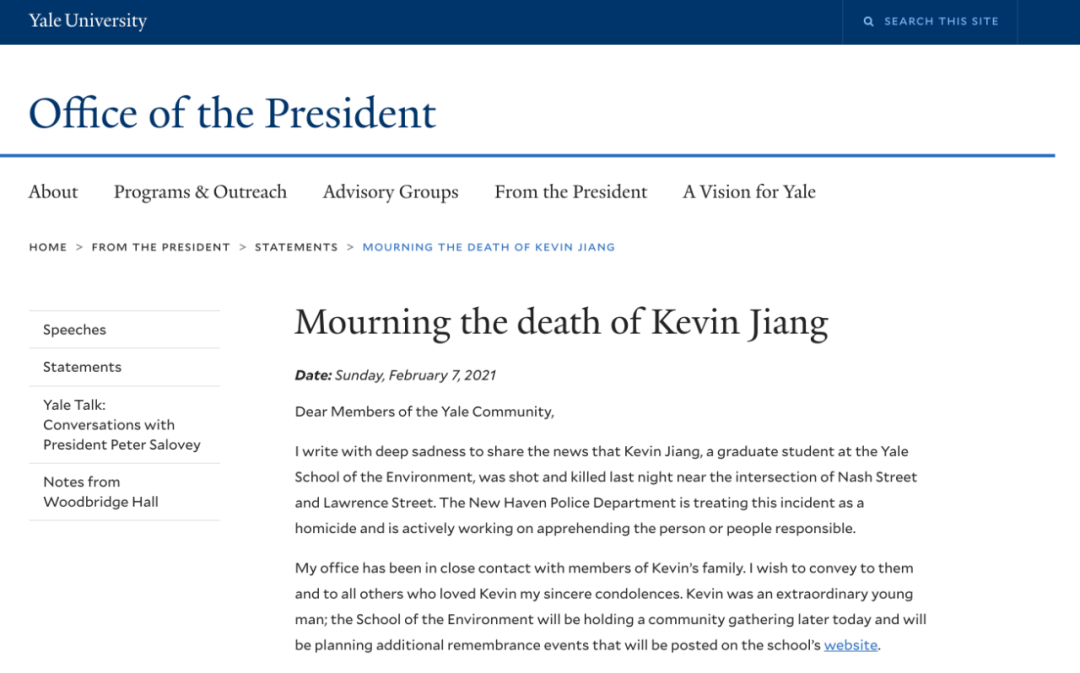 耶鲁大学在官网上表示沉痛哀悼,“我的办公室一直与凯文的家人保持密切联系,我向他们和所有爱凯文的人表达诚挚的哀悼。凯文是一个非凡的年轻人!”