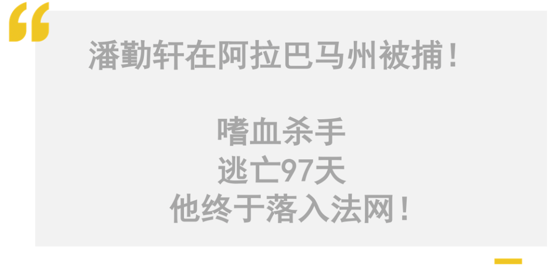 逃亡三个月的潘勤轩一直在和警察玩捉迷藏,本周五早上,警方终于在阿拉巴马逮捕了他!