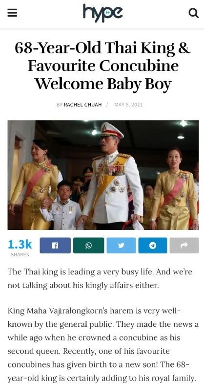 如今,据英文媒体HYPE爆料称,泰王的一位不知名的情妇在近期又替他产下了一个私生子,也被送往瑞士抚养。年近70尚能喜得麟儿,不得不说泰王也算是老当益壮了。
