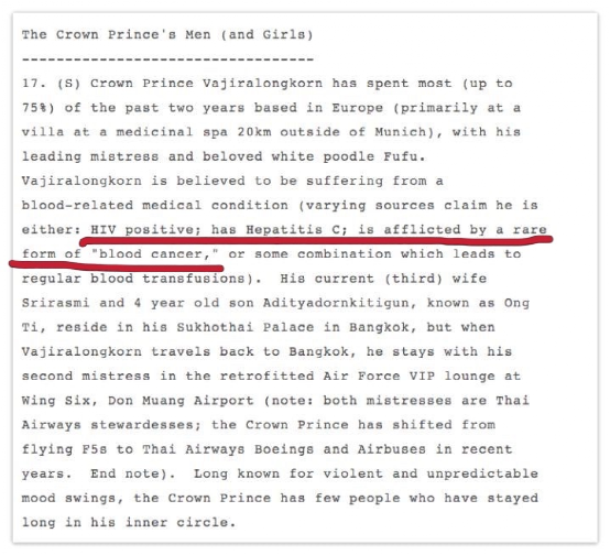 事实上泰王身体一直不好,在维基解密(WikiLeaks)之前发布的一份美国秘密电报中提到:泰王患有艾滋病、丙型肝炎及一种罕见的血液癌症。
