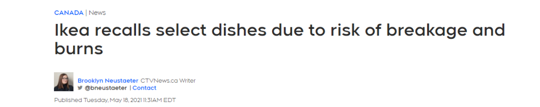 5月18日,宜家加拿大公司发布声明,召回部分可能存在烫伤风险的餐具。