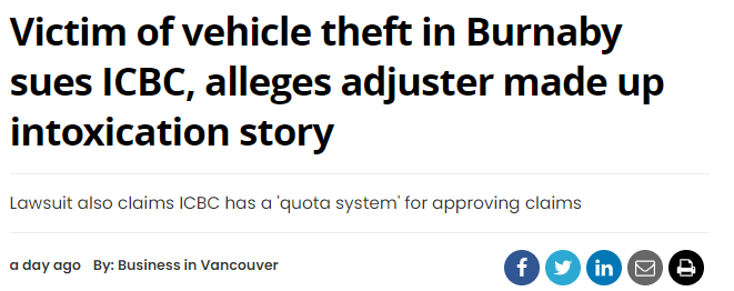 诉讼文件还指控ICBC在其保险索赔系统中,拥有一个“配额制度” ,以作为专门研究车辆盗窃或损坏的赔偿标准,而不是根据车主的索赔案件来进行判决。