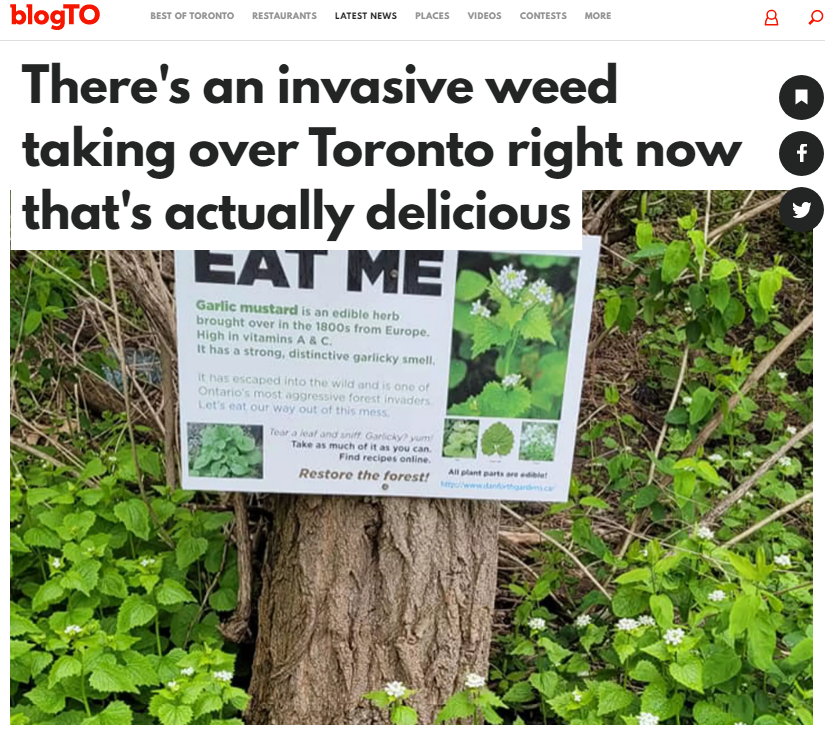 多伦多这种野菜长疯了!跪求大家摘来吃!炒肉凉拌味道好极了…2021-05-19 |作者: | 来源:加拿大超级话题加拿大美食Loading...分享: 在加拿大生活户外的各种植物真得好好认清了! 有的,有剧毒不能碰,小心灼伤; 有的,好看也不能摘,否则罚款; 还有的。。。 现在跪求你赶紧摘了吃吧~ 能帮助解决环保问题而且这种野菜营养味道都好极了! 到底是什么植物呢? TA,就是 蒜芥(garlic mustard) 长这样的 ↓↓ 绿色的植物上冒着小而精致的白花 是一种最具侵略性的入侵类植物。 蒜芥这种植物于1800年代从欧洲来到北美, 由于在加拿大没天敌, 所以近年在北美的郊区茂盛繁殖, 但却扼杀了本土原生植物生长空间。 这些看起来无害的植物可以长到一米高, 对加拿大本地生物多样性构成了严重威胁。 但是! 这种对生物平衡有害的野菜 对于吃货来说却是美味又营养的美食! 蒜芥含高剂量的维生素A和C, 对降胆固醇,保护心脏等都有好处。 而且其食之碧绿清爽, 叶子被碾碎时,会散发出蒜香味 有点像雪里红和马兰头和混合风味~ 还带有可口的大蒜味, 不仅适合当色拉凉拌 还可以炒肉,炸酱~ 甚至可以作香蒜酱等调料… 蒜芥已经在整个北美蔓延 在这一点上,它已经失控了 现在,多伦多自然保护组织说,解决蒜芥疯长最好的方法就是吃掉它们! 在多伦多一些地方,比如Warden Woods,Danforth Gardens 等居民小区的绿化带 已经有自然保护协会张贴了些标志, 鼓励当地人采摘和吃蒜芥! 以帮助恢复森林恢复自然形态。 那么,怎么辨识蒜芥呢? 据加拿大安省政府官网描述: 蒜香芥末是一种高达膝盖的植物, 叶子是绿色的,开小白花, 黑色种子包在豆荚中, 摘的时候一定要连根拔除。 蒜芥怎么吃? 1. 拌色拉 自带的清香和蒜味适合放在色拉中 拌点Costco的网红芝麻酱即可。 2. 凉拌 当作凉拌菜的配料, 和胡萝卜丝,黄瓜丝,粉丝,豆皮丝等 放入凉拌菜调料… 3. 炒肉片/肉丝 野菜蒜芥炒肉片, 现在油锅里爆香肉片,肉丝 然后放入蒜芥翻炒调味即可。 4. 拌入当饺子馅 饺子馅里放入蒜芥也很不错! 5. 做成香蒜酱 制作成Pesto香蒜酱 可以浇在意大利面上吃~ 6. 三明治里夹着吃 在三明治的肉旁放几片 不仅增加口感清爽还有蒜香~ 好了! 既能除害,又能饱口福,还能解闷~ 这种3赢的好事不错哟~ 蒜芥摘(吃)起来… 声明:转载此文是出于传递更多信息之目的,并非代表本站支持其观点。若有文字、图片及视频等素材来源标注错误或侵犯了您的合法权益,请作者持权属证明与本网联系,我们将及时更正、删除,谢谢。阅读 未经允许不得转载:加拿大乐活网 »多伦多这种野菜长疯了!跪求大家摘来吃!炒肉凉拌味道好极了…分享: