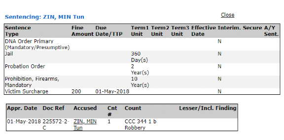 “Zin,Min Tun”还曾于2017年因抢劫罪被判一年有期徒刑、缓刑两年。法院还禁止其在10年内接触枪械火器。