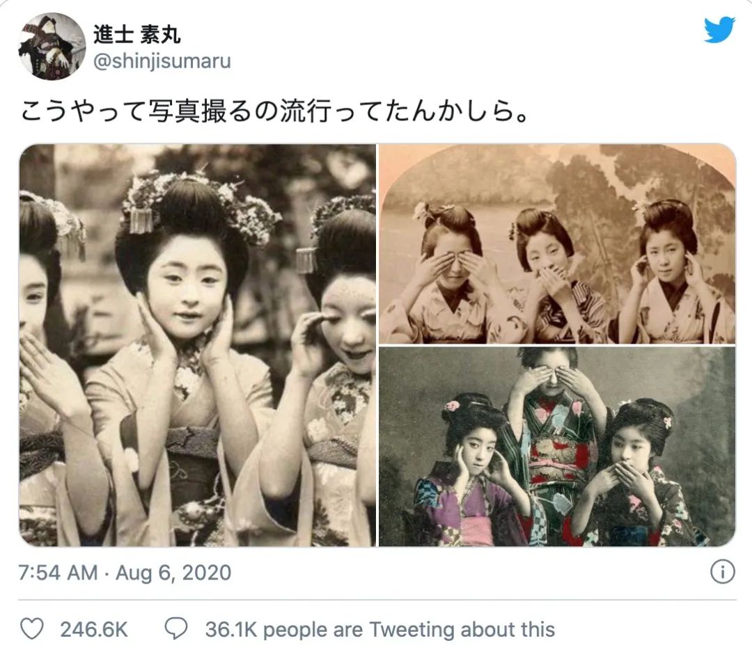 前不久,一组图刷爆了推特,引发二十多万人的关注。这组图是关于艺伎上世纪的的拍照姿势。