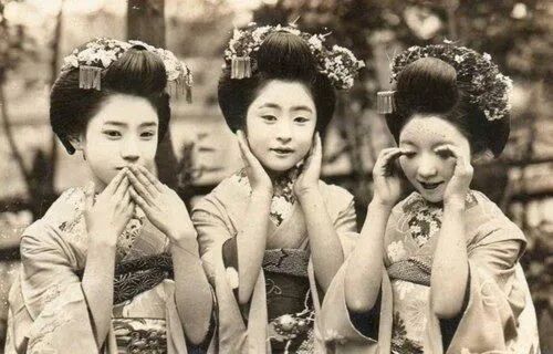 照片中的艺伎们分别捂住嘴巴、耳朵和眼睛,像是某一种拍照程式。