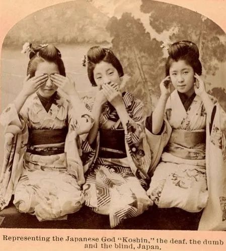 一个双手捂眼做惨不忍睹状、一个双手捂嘴做噤若寒蝉状、一个双手捂耳做置若罔闻状,这和上述艺伎的拍照姿势如出一辙。