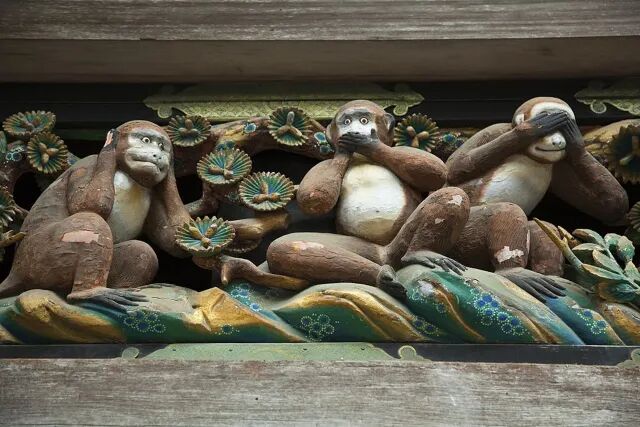 在日本一座幕府时代的寺院里,就有一尊名为“三个智猴”(三不猿)的雕像——