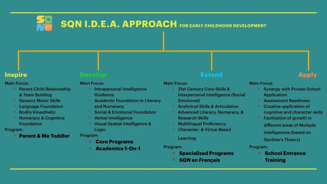 SQN通过多元化的活动来提升孩子的21世纪技能, 比如分析与检索能力,创意能力与设计思维,自信心与表达能力等等。另一方面通过我们的一对一定制式的课程来加强孩子的学术基础 (包括Literarcy拼读/读写,Numeracy数学,和Multilingual外语)