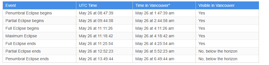 在温哥华观赏的话,将从5月26日凌晨2:44开始,凌晨4:11达到完整的月全食,结束于凌晨4:25,月亮落在凌晨5:26。