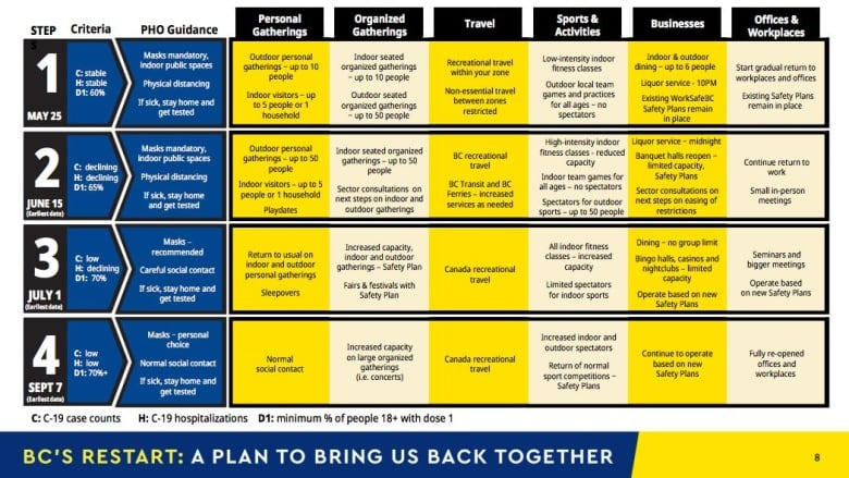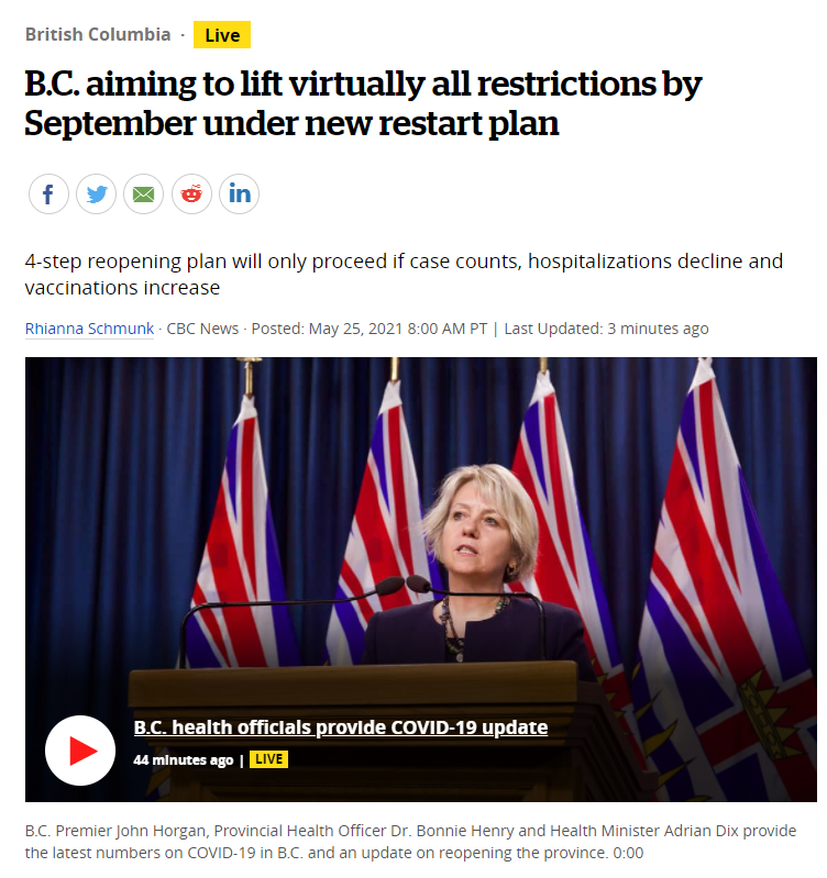 5月25日,BC 省省长贺谨、首席卫生官邦尼和卫生厅长宣布了最新的疫情数据并公布了这项四步走计划,该计划为期四个月,将根据全省新冠确诊人数和住院人数的下降安全有序地逐步推进。