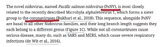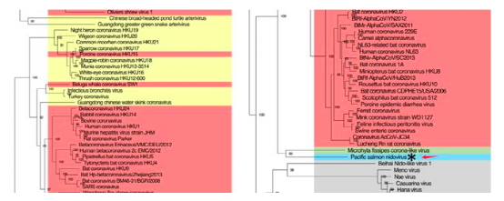 而之前UBC(加拿大不列颠哥伦比亚大学)的科学家们还在三文鱼身上发现了另外一种病毒PsNV(Pacific Salmon Nidovirus),对三文鱼有高致死性。目前,这种病毒已经感染了15%的养殖三文鱼。更可怕的是,PsNV病毒竟然与新冠病毒同目,是新冠病毒的姐妹群。(如下图)