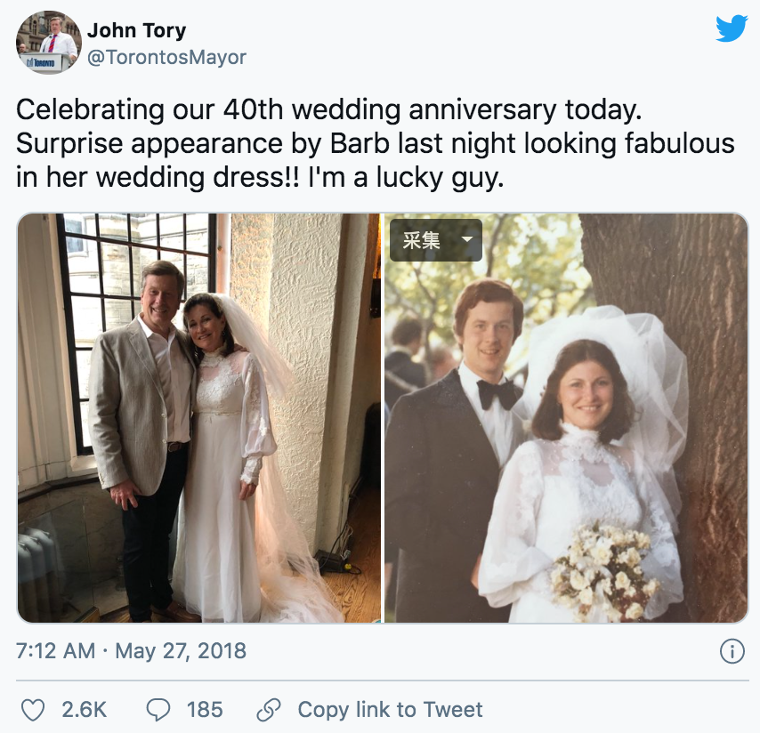 在结婚40周年之际,庄德利和太太重回当日行礼的教堂(Islington United Church),太太再次穿上当年的婚纱给了他一个惊喜。庄德利发推特晒幸福,称自己娶到Babara Hacket非常幸运!