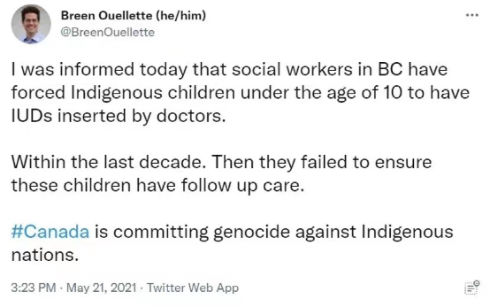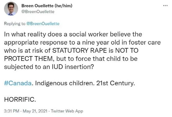 布林·欧莱特在推特上写道:“在什么样的社会里,社工会认为避免一个9岁女童被强奸的最好方法,不是保护她们,而是放置宫内节育器?这就是21世纪发生在加拿大原住民儿童身上的事!”