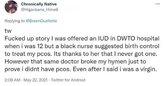 “DWTO医院在我12岁的时候,就让我放宫内节育器,还好一个黑人护士告诉我合理避孕就能治疗多囊卵巢症,我才没有放节育器。但同一个医生破坏了我的处女膜,只为了搞清楚我到底有没有多囊卵巢,哪怕我明确告诉她我还是处女”。