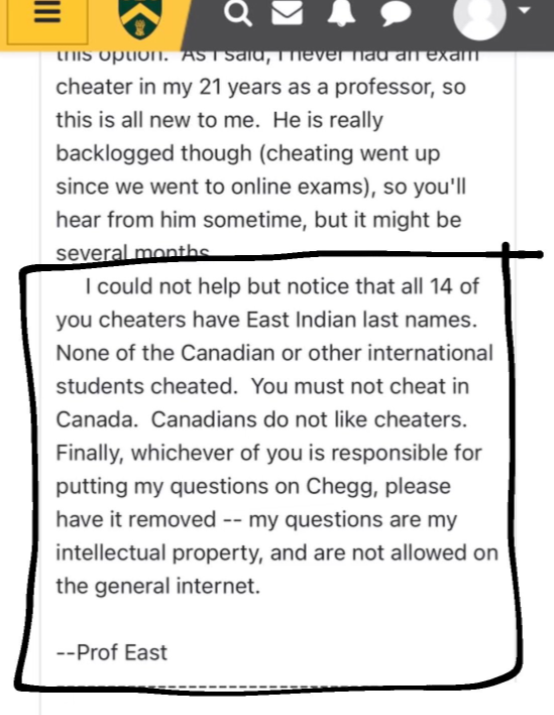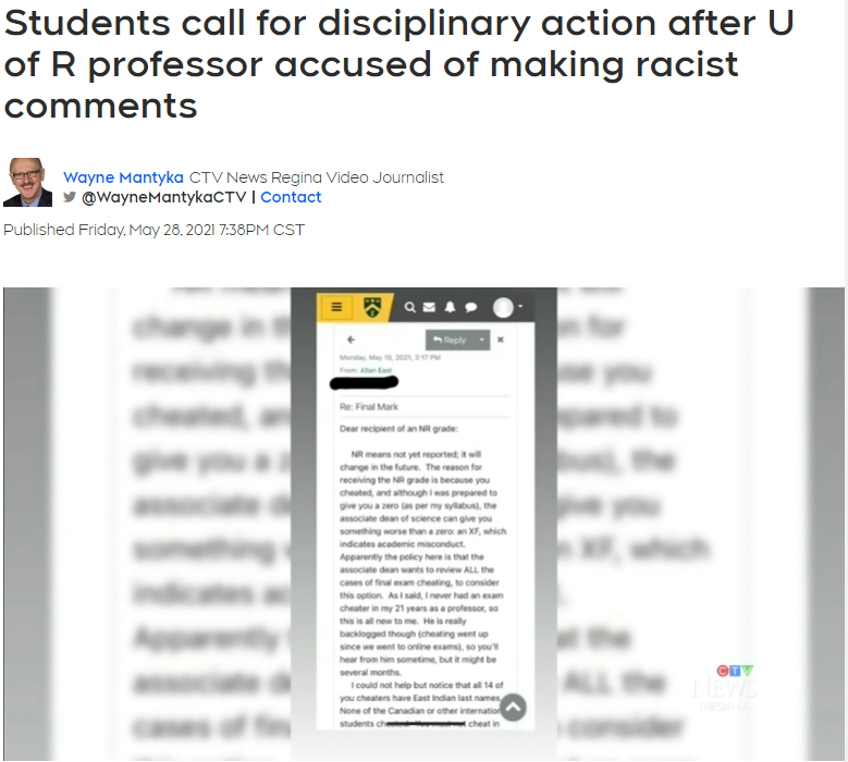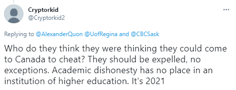 加拿大一群亚裔留学生作弊被抓,却把教授逼到道歉!2021-05-31 |作者: | 来源:温哥华头条加拿大教育Loading...分享:#加拿大#教育 一群作弊的学生被抓, 却集体状告学校, 要求对教授进行纪律处罚, 并且最后还成功了… 得到教授的公开道歉! 这样的事, 大概也只有在加拿大, 才会发生吧! 近日, 加拿大里贾纳大学的 (University of Regina) 学生们集体呼吁校方, 对一名化学教授Allan East, 采取严厉的纪律处分! 原因是, 这名教授对作弊的学生, 发表了种族主义言论。 事情是这样的… 在化学课的在线Final考试中, 有14名学生作弊被East教授发现, 在群发给他们的邮件中, East教授指出, “我注意到所有作弊学生, 都是东印度的姓氏。 其他留学生及加拿大本地学生, 都没有任何学术不端行为。 在加拿大, 你们绝对不能作弊! 加拿大人不喜欢骗子!” 收到邮件的作弊学生, 以及其他看到邮件内容的学生, 都对East教授的言论, 感到震惊和愤怒! 于是, 这事儿就闹到了校长那儿… 对此, 里贾纳大学很快发声, 称电子邮件中表达的观点, 是不恰当的。 该校的代理校长, Thomas Chase说, “我,再次重申, 个人的言论不能代表, 我们学校绝大部分的教职员工, 很抱歉让学生们遭受这样的经历。” 最后, East教授公开向学生们道歉, 并承认自己对种族和国籍的评论, 是“不当且错误的”。 “我的言论对大家造成了伤害, 对此我深表歉意, 我将继续接受培训, 以更好地理解, ‘尊重,平等和多样性’。” (Allan East教授) 然而, 对于这个道歉, 广大学生们并不满意, 强烈要求更严厉的处罚! 一名学生Yaqoob说道, “我认为任何形式的培训, 都无法抵消教授所带来的伤害, 他应该辞职。” 另一名学生Osaid Diar Bakerli说, “如果我是他班上的学生, 尤其是东印度裔的学生, 肯定会对自己的成绩产生质疑, 因为你都不知道他的打分, 是否基于他的偏见…” 截止目前, 在化学期末考中被发现作弊的学生, 均未获得该课程的学分(Non Credit), 该大学尚未表明, 是否计划对这些学生和教授, 采取进一步的行动。 在这起事件中, 发表种族主义言论的教授, 被曝光信息并已经公开道歉, 而对于那些作弊的学生, 校方却只字未提, 网友们议论纷纷。 “怎么处罚作弊者?开除教授,开除作弊的学生!” “只有在加拿大,作弊的人还可以得到道歉!简直疯狂,曝光这些学生的名字。” “留学来加拿大作弊?这些学生都应该被开除,无一例外。都2021年了,加拿大高等教育机构不该容忍任何学术不端行为。” “太搞笑了吧!很快我们就没有言论自由,现在似乎说什么都是令人反感的。” 对此, 大家怎么看? Ref:https://regina.ctvnews.ca/students-call-for-disciplinary-action-after-u-of-r-professor-accused-of-making-racist-comments-1.5447825 阅读 未经允许不得转载:加拿大乐活网 »加拿大一群亚裔留学生作弊被抓,却把教授逼到道歉!分享: