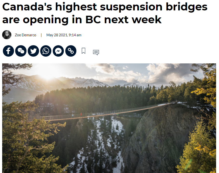 太美 ¦ “加拿大最高吊桥”即将开业!震撼程度远胜卡普兰诺吊桥?2021-05-31 |作者:看见加拿大 | 来源:她乡LaChic她乡分享:#加拿大,旅游 看见加拿大 小众之旅 2021.5.29 曾几何时谈到吊桥公园,位于北温哥华的卡普兰诺吊桥是最佳选择:长度最长、宽度最宽、历史最悠久。如果想要体验免费吊桥,那么卡普兰诺附近的林恩峡谷吊桥也不错。 时过境迁,加拿大各大景点在吊桥上的争夺日趋白热化。光是在大温和大温周边,就有多个全新吊桥出现,比如大家熟悉的海天缆车山顶吊桥、惠斯勒黑梳山吊桥等等,想要盖过卡普兰诺吊桥的风头。 如今,最新的一座吊桥“横空出世”,它将一举成为加拿大全国最高、最震撼的吊桥,而且在6月4日就正式营业! 它就在BC省,位于Golden市,名叫Golden Skybridge。如前文所说,Golden Skybridge的对外宣传口号即是:体验全加拿大最高的吊桥吧! 比卡普兰诺吊桥,足足高一倍 Golden Skybridge距离脚下的山谷足足有140米左右,比卡普兰诺吊桥高了一倍。140米,相当于你在40层楼的高度走吊桥,想想都刺激。 Golden Skybridge拥有两座吊桥,另一座吊桥也有80米高,为游客提供360度的壮阔高山景观。在吊桥下,还有61米高的瀑布、峡谷底部的涓涓溪流。 就像卡普兰诺吊桥公园那样,Golden Skybridge也是一个大型自然公园,也有树间漫步、多条步道、有蹦极有滑索、还有野炊区域,非常完整。 蹦极?没错,Golden Skybridge的双人蹦极(Tandem Bungee Swing)将会在夏天晚些时候开放,而Zipline滑索将会横跨峡谷,足足有1200米长。 想体验一些不刺激的?Golden Skybridge的自然步道有3公里长,穿梭于整个公园和两座吊桥之间,设有多个观景平台来欣赏美景。户外花园、咖啡馆餐厅,当然也是标配的。 Golden Skybridge的票价比卡普兰诺吊桥公园还要便宜一些:成人34元、儿童17元,每年的6月到10月开放; 在谈到Golden Skybridge开业时,吊桥所属的Pursuit公司总裁David Barry难掩兴奋之情: “在多年从业经历中,我们一直专注于通过令人难忘的景点,来给客人至高的旅行体验。无论你是住在Golden,还是经常经过这里,只要来一次Golden Skybridge,都会让你惊叹不已。” “我相信,Golden Skybridge将会成为加拿大的代表作之一,也会成为国际著名景点。” 唯一的缺点?距离!但是…… 一定要说缺点的话,那一定是距离。熟悉BC内陆城市的人知道,Golden已经位于BC和阿尔伯塔的交界处,距离班夫非常近,距离卡尔加里也比较近。 如果从温哥华开车,足足有700公里的路程,需要8个小时的驾驶。安排4~6天的行程比较合适,周边还有翡翠湖、奥哈拉湖这样的著名景点。 因此,Golden Skybridge注定不可能成为周末、长周末的景点,只能是中长途自驾时去体验。往好的方面想,以往开车去班夫的时候总觉得路上只有青山绿水,没有刺激的景点,但从今年6月开始可就不一样了。 大家完全可以在Golden住上一晚,第二天早上先来Golden Skybridge体验一下加拿大最高吊桥,然后再启程去班夫、贾斯伯,让旅程更为丰富充实。 这座吊桥,还能提升整个城镇的知名度 Golden Skybridge对于Golden这座城市来说意义非凡,作为班夫入口处的它,却总是被游客们忽视,认为“只是个加个油、吃个饭的地方”。随着Golden Skybridge的到来,Golden终于有了自己的代表作。 事实上,当你去Golden Skybridge游玩时,正好可以领略一下Golden小城的其他魅力,这里也是有著名景点的: Kicking Horse Mountain Resort、Whitebooth Brewing Company、Purcell Heli Skiing……此外,Golden小镇市中心也是文艺气息爆表,如今有了最高吊桥,更是魅力非凡。 在跨省旅行暂时被限制的时候,Golden的确“很受伤”,好在Golden Skybridge的出现,一定能为Golden带来足够多的人气,重振小镇的经济。 五大吊桥,让BC省旅游熠熠生辉 当Golden Skybridge开业后,BC省著名的吊桥公园已经有5个: 卡普兰诺吊桥公园、林恩峡谷吊桥公园、海天缆车吊桥、惠斯勒吊桥、Golden Skybridge。 这个夏天因为疫情还未完全结束,大家的旅行范围还得在BC省内,为何不安排一次吊桥之旅呢?大家总谈论BC省的山脉、海滩、瀑布、湖泊……吊桥也是有谈资的。 对了,Golden Skybridge的另一大卖点是景色:落基山脉环绕,注定让这座吊桥周边景色最震撼。是不是已经想要动身了?尽管6月4日就开放,但毕竟属于跨区旅行,大家还得等到6月15号。 阅读 未经允许不得转载:加拿大乐活网 »太美 ¦ “加拿大最高吊桥”即将开业!震撼程度远胜卡普兰诺吊桥?分享: