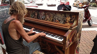 这一天,这位蓬头垢面的流浪汉经过这里,看到了钢琴,原本黯淡无光的眼神顿时亮了起来。
