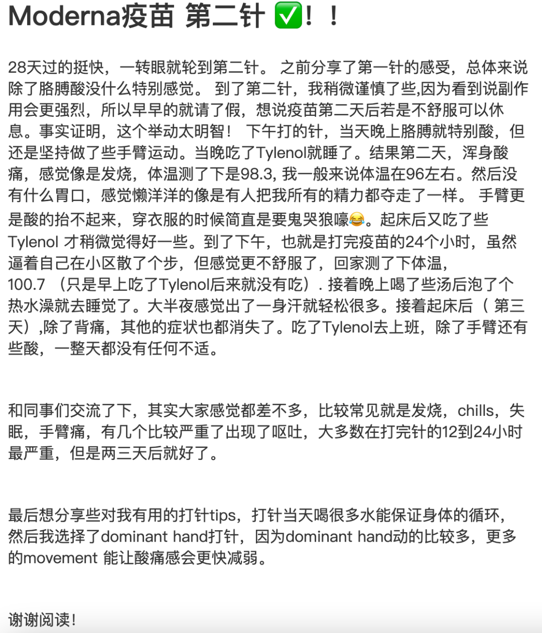 此外,有网友分享了自己注射第二针Moderna的经历: