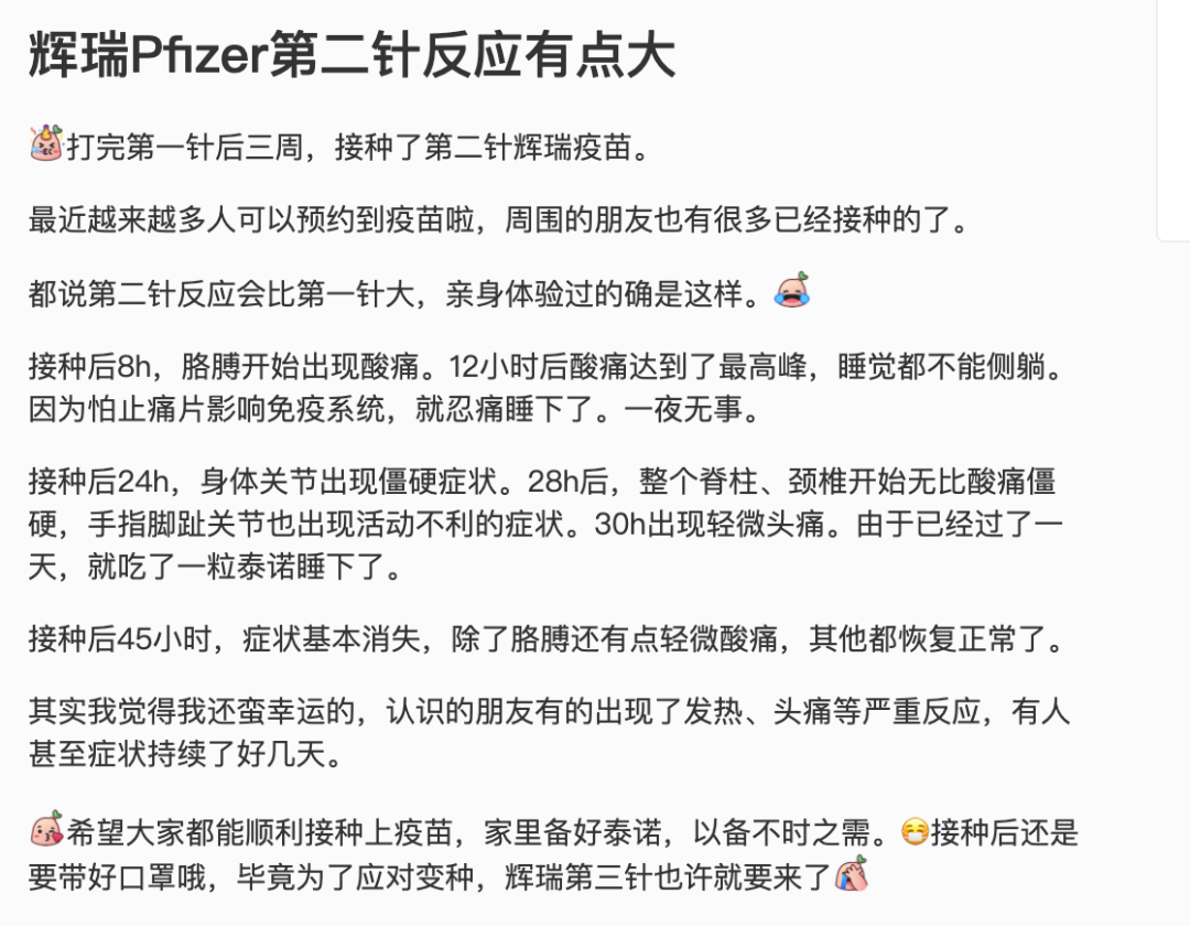 另外,也有网友分享了自己注射第二针辉瑞的经历: