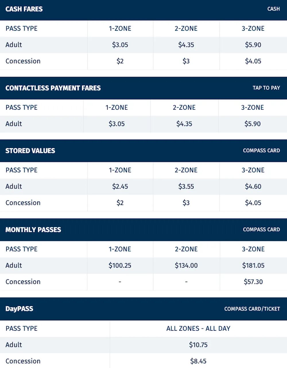 使用Compass Card乘车,单区(One-zone)成人票涨5分,两区(Two-zone)成人票涨10分,三区(Three-zone)成人票涨15分。