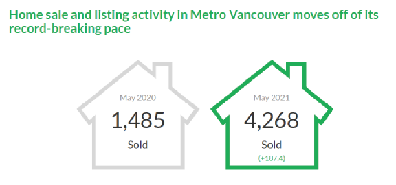 6月2日,大温地产局(REBGV)发布了5月的地产交易报告。报告显示,2021年5月,整个大温地区共卖出4268套物业,同比2020年5月上涨187.4%,但环比2021年4月却下降了13%。
