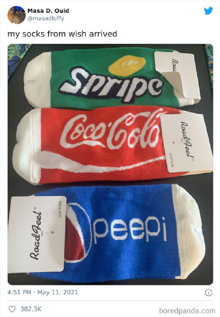 我喜欢的袜子们到了 ,可是 PEPSI(百事)成了peepi,可口可乐(Cocacola)成了Cocococo,雪碧(Sprite)成了Spripe,我说,你还能再山寨点吗?