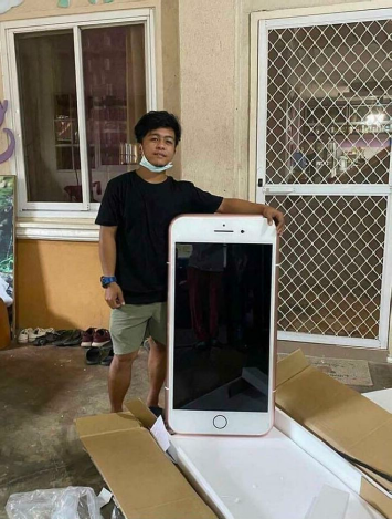 这个小哥看见一个巨便宜的苹果手机 ,一激动,手一抖 ,结果买回来发现是咖啡桌,不过是苹果最新款的呢!看表情很满意!