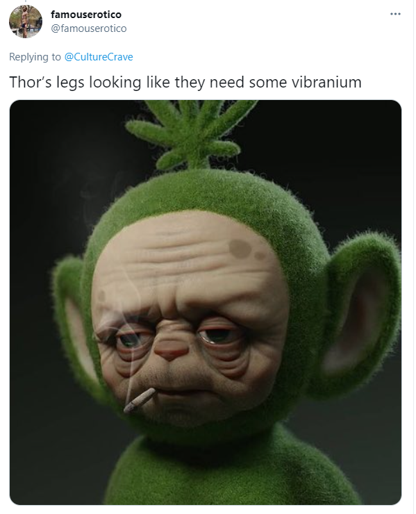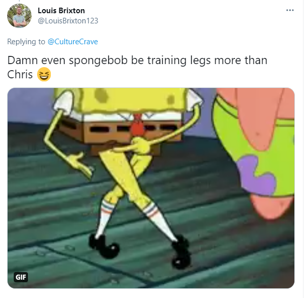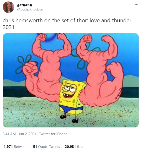 在这条有超过两万赞的推文中,用一张上肢异常强壮,但小腿很细的海绵宝宝的表情包,来暗讽锤哥的身材: