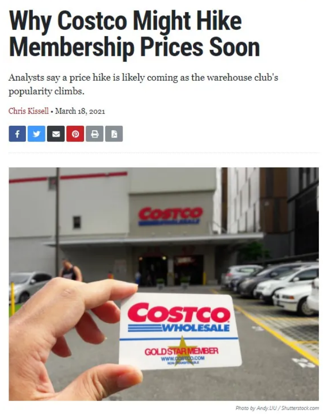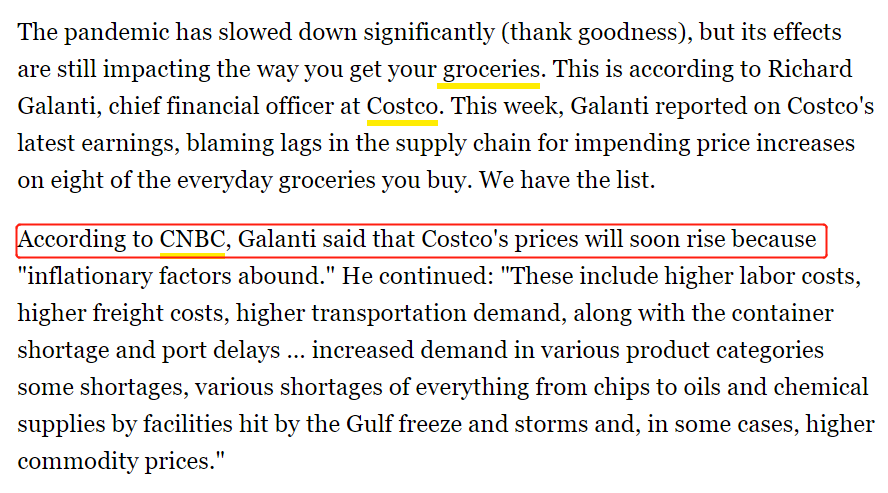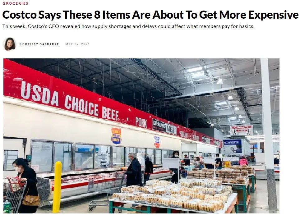 加兰蒂(Richard Galanti)表示,Costco 的价格很快就会上涨,因为“通胀因素比比皆是”。他还表示,“涨价的因素包括更高的劳动力成本、更高的运费、更高的运输需求,以及集装箱短缺和港口延误,各种产品类别的需求增加,从芯片到石油和化学品供应的各种短缺,海湾的冻结和风暴原因等等。”