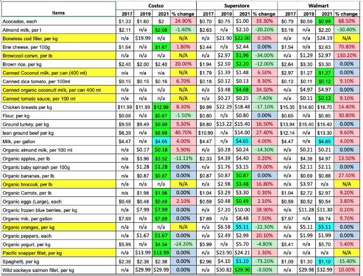 对Costco,Walmart和SuperStore的物价