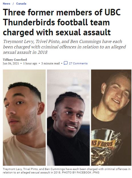 皇家骑警表示,警方于2018年11月5日下午接到一名女子报案,该名女子称她于温哥华Acadia Rd一个住所内遭到3名男子性侵,3人都是UBC Thunderbird前队员。