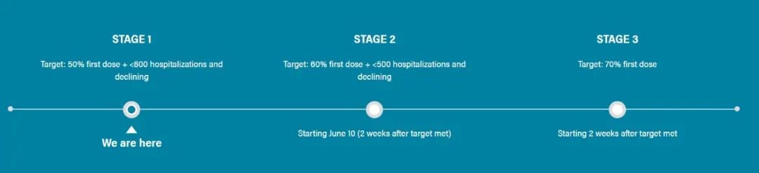 第二阶段:在至少有60% 的12周岁以上的阿省人口接种第一剂疫苗,且新冠住院人数低于500并持续下降的两周后(即6月10日)生效。第二阶段的开放规定将比第一阶段稍微松弛,员工可以不再从家中远程工作,但安全社交距离与口罩佩戴等要求仍然有效。