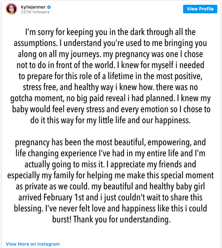 2019 年 2 月 18 日,Kylie晒出了戒指。